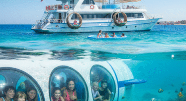 Enjoy the Panorama Submarine Trip in Hurghada, featuring an underwater panoramic hall, kids swimming pool, snorkeling, and fun entertainment. Perfect for families and children. Multiple daily trips available. Book now with Travigo Egypt!